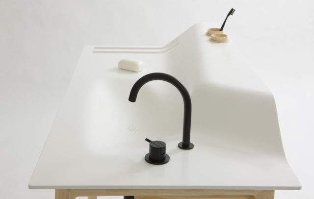 When it all started I was even thinking about using wood only. There is a very interesting technology of molding plywood in 3D shapes. But we pretty fast ended up to use mineral composite for the sink. This can be thermo-molded and it is thus predestinated for organic and flowing shapes, like a landscape, natural shapes of lakes and rivers where the water flows through. Shapes that are a pleasure to touch, to follow with your hands and to watch the water going down. In HI-MACS® we found the perfect partner for my project. They provided material support in a quick and uncomplicated way and connected me to manufacturers having the necessary knowhow. Even though it does not look like it, the shape of the Private Space Washstand is pretty much at the limit to what a one piece sheet of mineral composite allows to do.