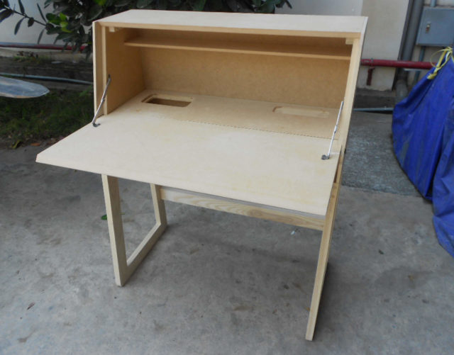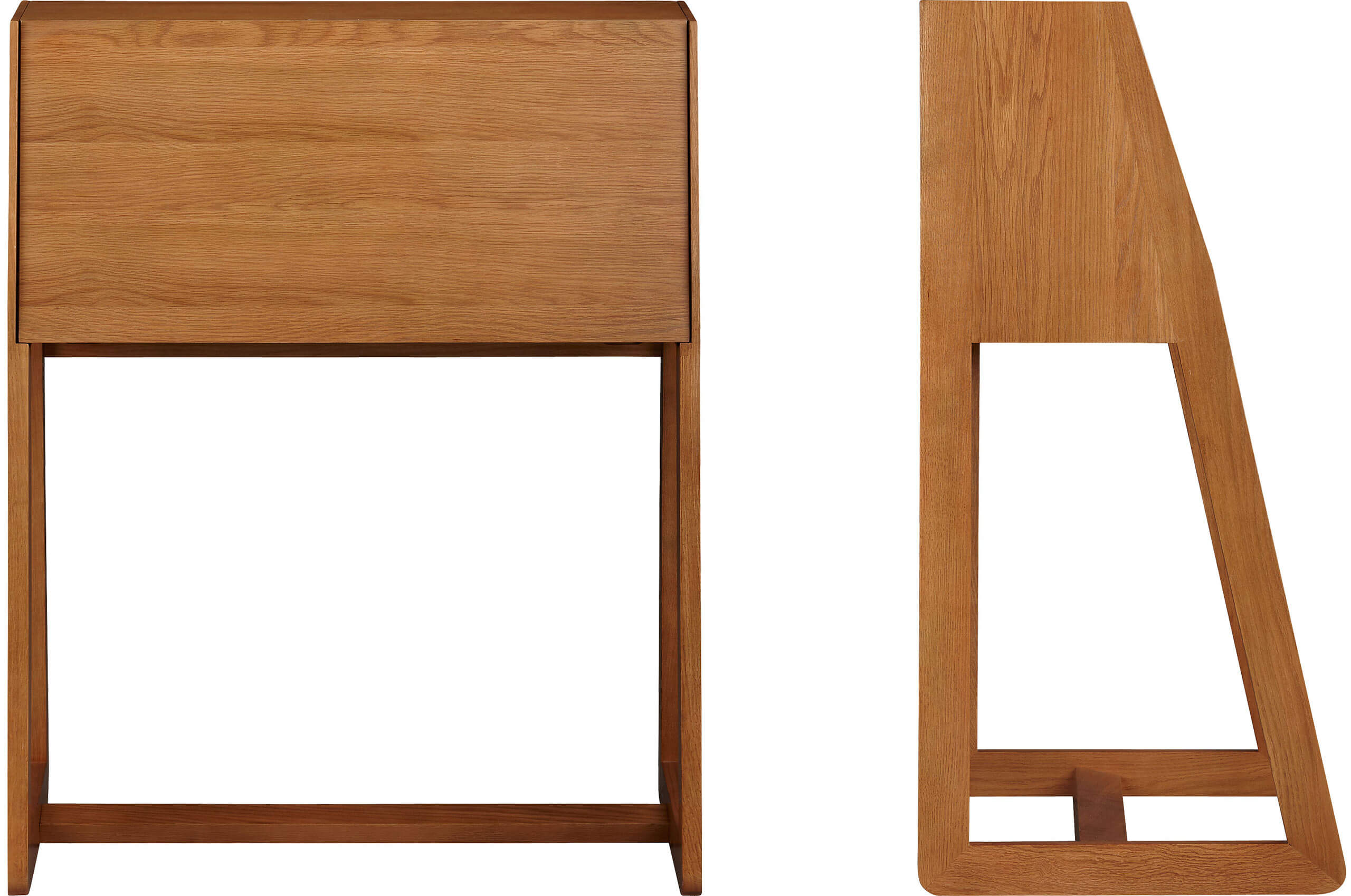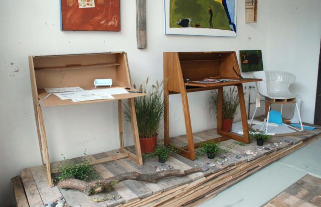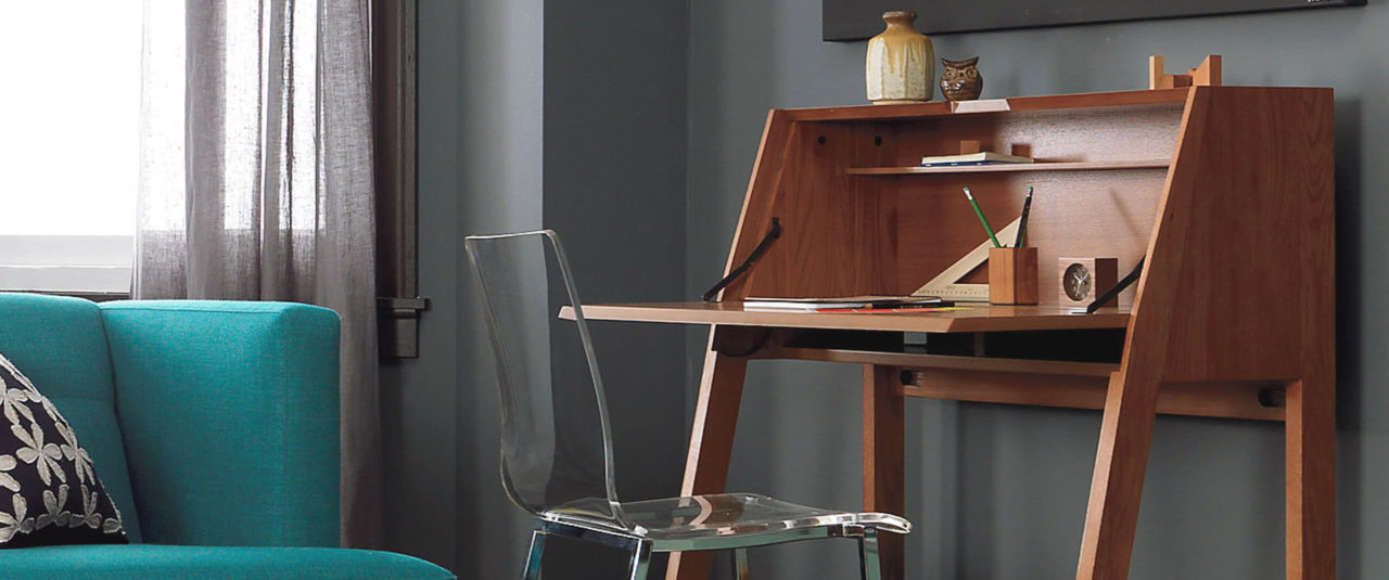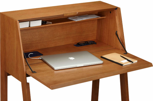 Möbel für kleine Stadtwohnungen stehen beim US amerikanischen Produzenten CB2 im Fokus. Abgestimmt auf diese Voraussetzungen entstand ein kompakter kleiner Schreibtisch, Intimo Secretary Desk. Zugeklappt verbirgt er unauffällig sämtiliche Arbeitsuntensilien. Während der Arbeit sorgen kleine Ablagen sowie eine mit Filz ummantelte Öffnung fürs Kabelmanagement für Ordnung.